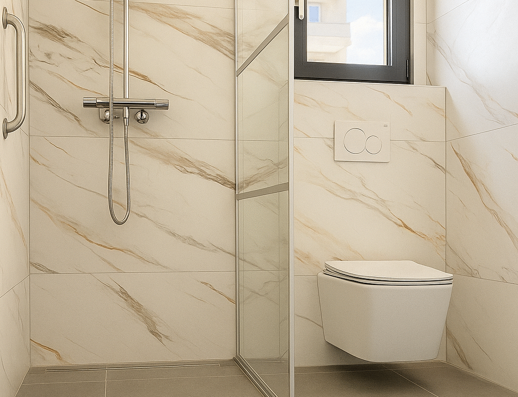 Shower room: Toilet, walk-in shower, sink, large tiles