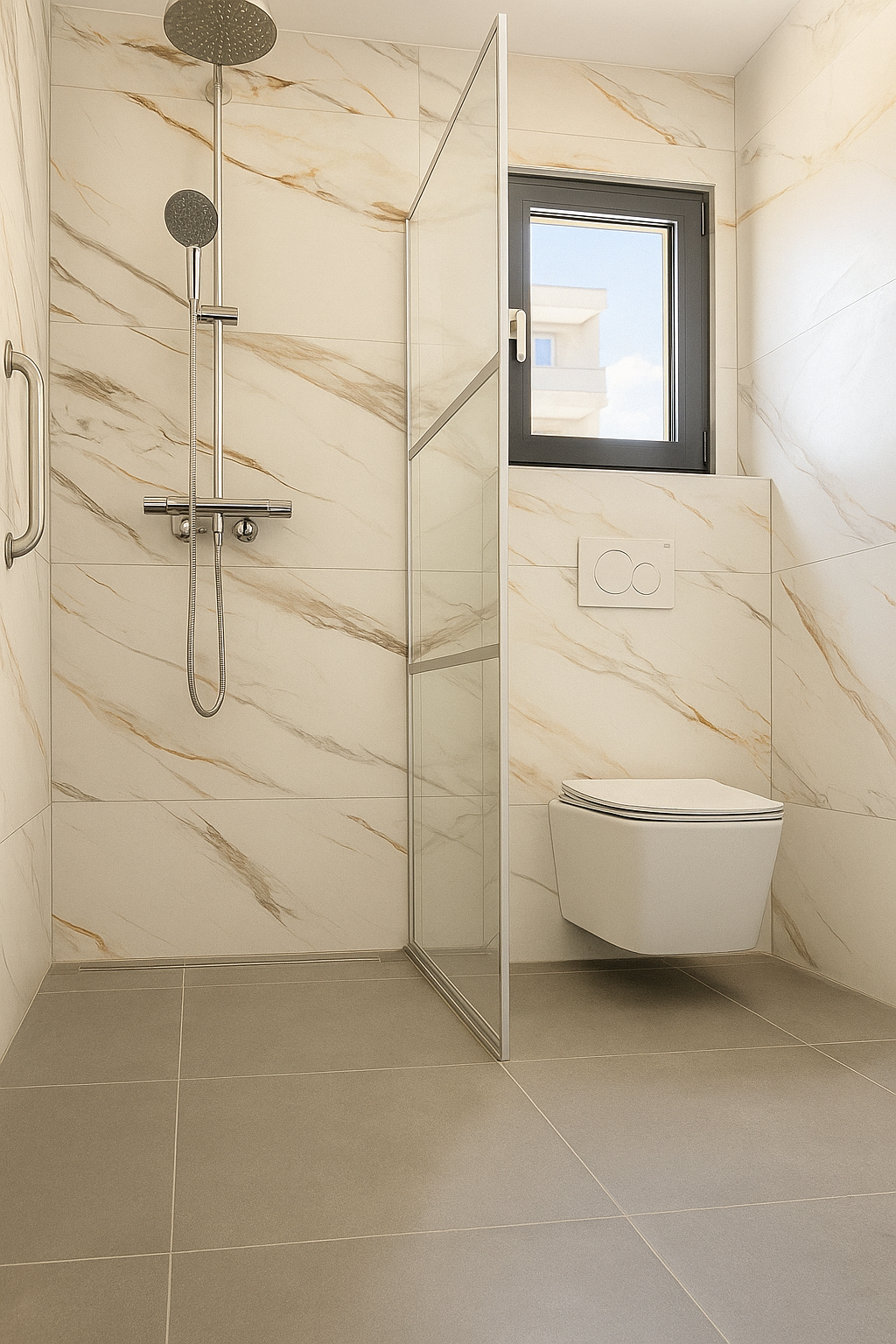 Shower room: Toilet, walk-in shower, sink, large tiles